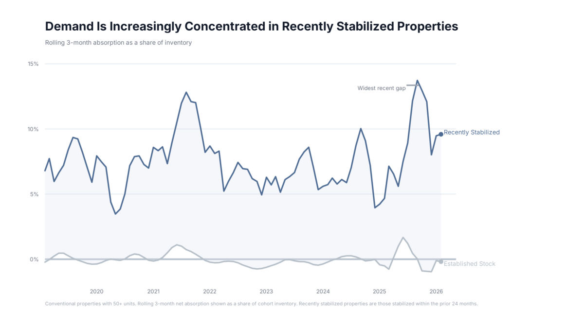 Properties built before 2024 lost roughly 114,000 leased units from October through February. A year earlier, properties the same distance from their completion year lost about 54,000 units during the same period. Headline demand figures increasingly mask diverging conditions across the multifamily sector.