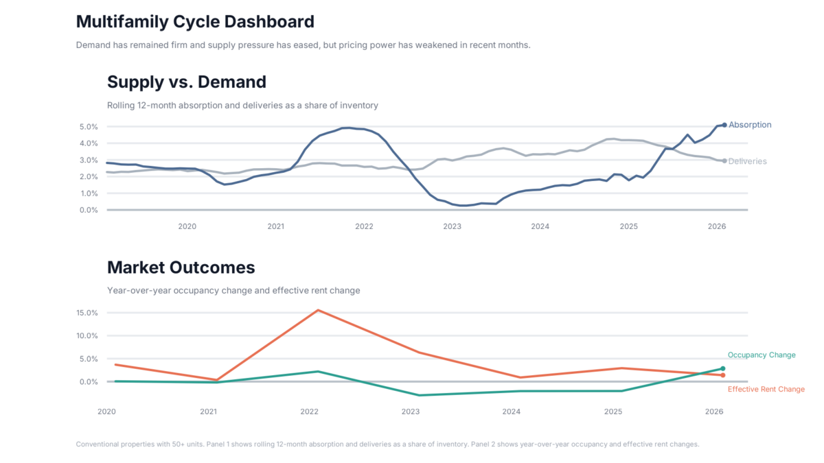 National net absorption entered 2026 on a three-year uptrend after bottoming out in 2022. Rather than stagnating, demand gained additional momentum last year. The last twelve months produced the strongest multifamily demand in several years.