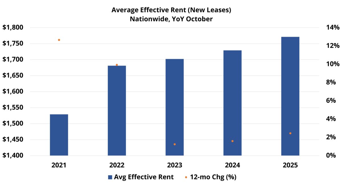 Through the first three quarters of 2025, rent growth was the strongest since 2022. By September, year-to-date effective rents were up nearly 3%, compared with roughly 2% gains in both 2023 and 2024.