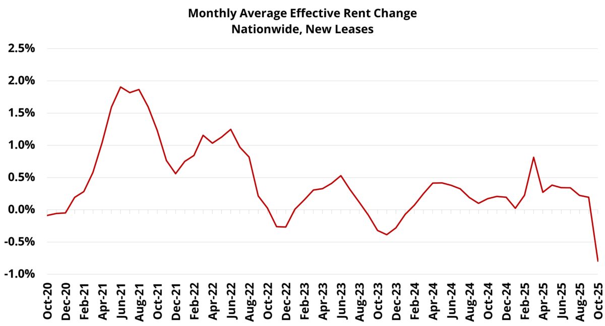 October’s 0.8% drop – the first monthly decline since January 2024 – was also the sharpest in more than five years. While monthly data are inherently volatile, the magnitude of this decline was striking and shifted the trajectory of 2025’s rent performance.