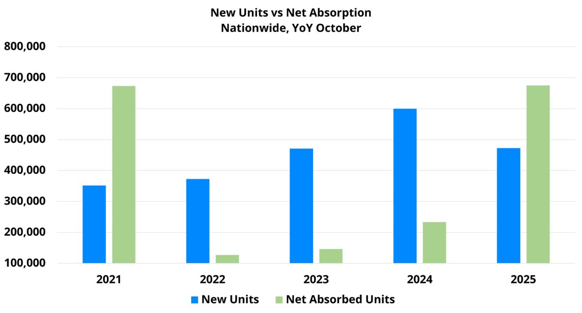 As of September, national net absorption had rivaled 2021’s record pace, occupancy had finally begun to recover, and rent growth was on a three-year upswing. This appeared to set the stage for a stronger 2026 for multifamily rent performance.